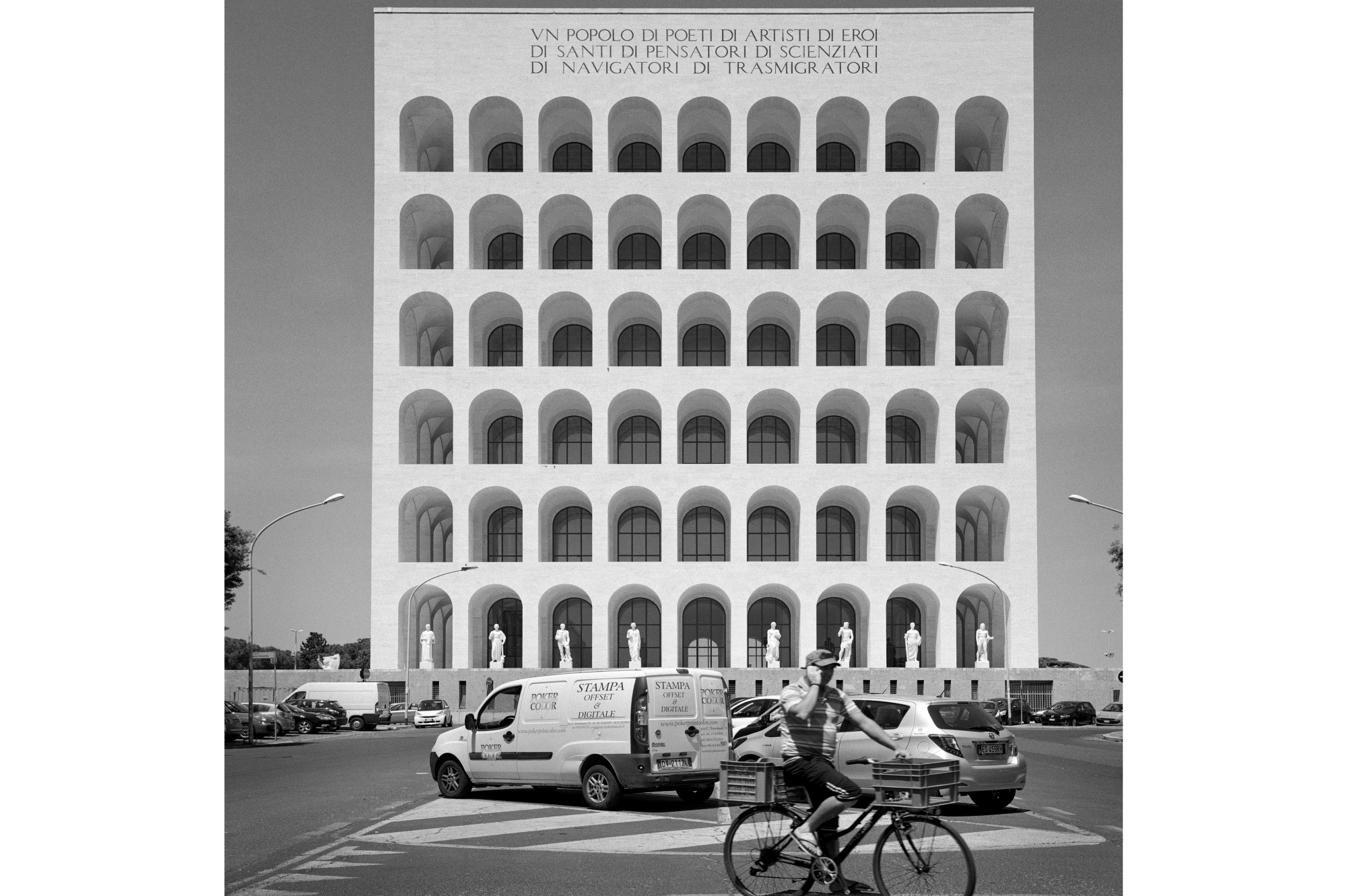 Across three years, Kippin has been resident in Rome, photographing the EUR zone – the Esposizione Universale Roma – that was planned and mostly built under Mussolini’s rule in the inter-war years – and even continued after the defeat of the fascist regime. The EUR lies outside the historical centre of Rome, and was intended to displace it, as a brand new centre. The failure of the fascist project ensured that it did not; but it became re-used for other needs. Commerce took the place of ceremonial uses; imperialist architecture today serves prosaic, mercantile purposes.